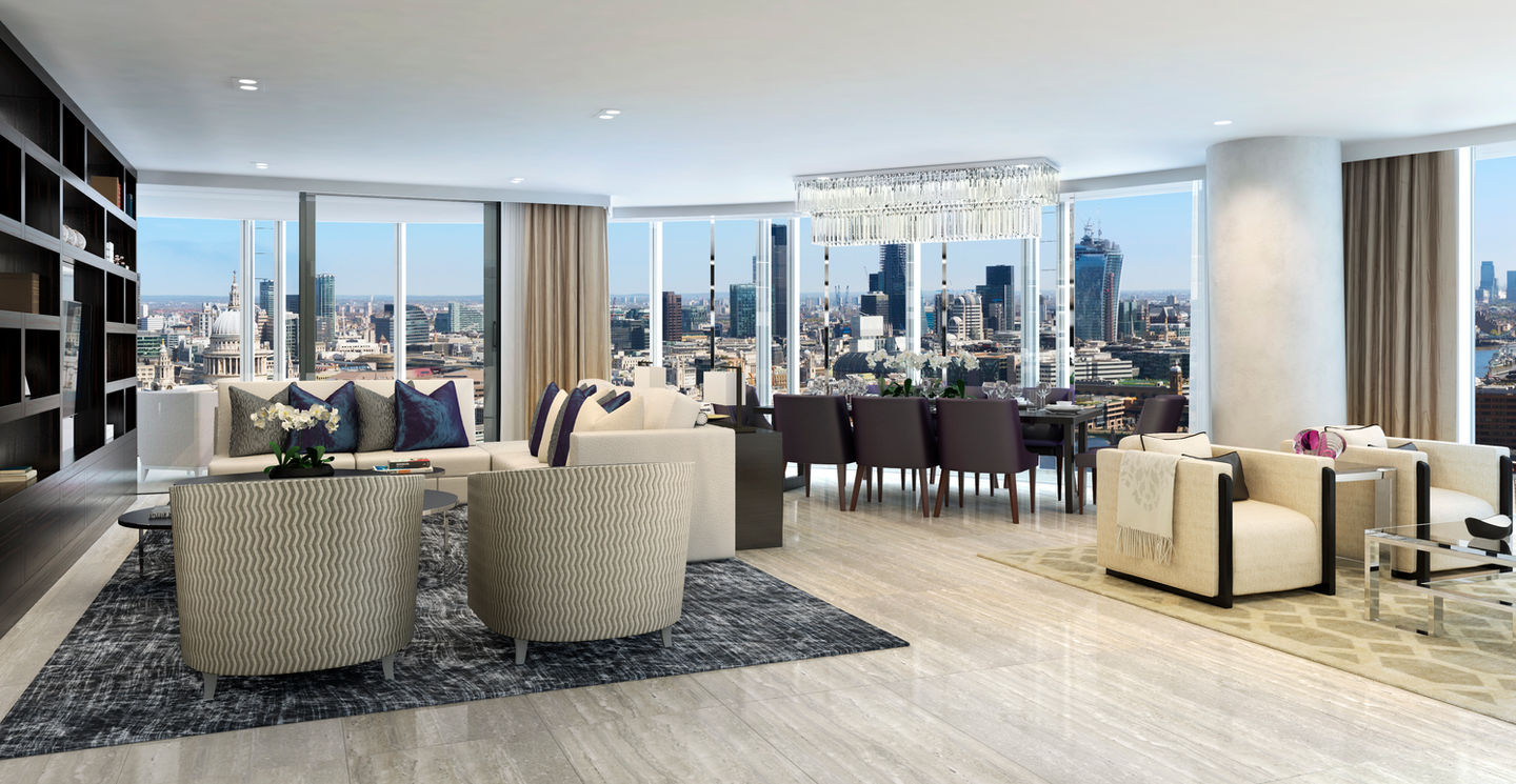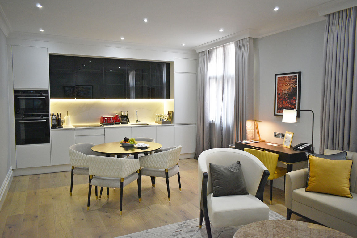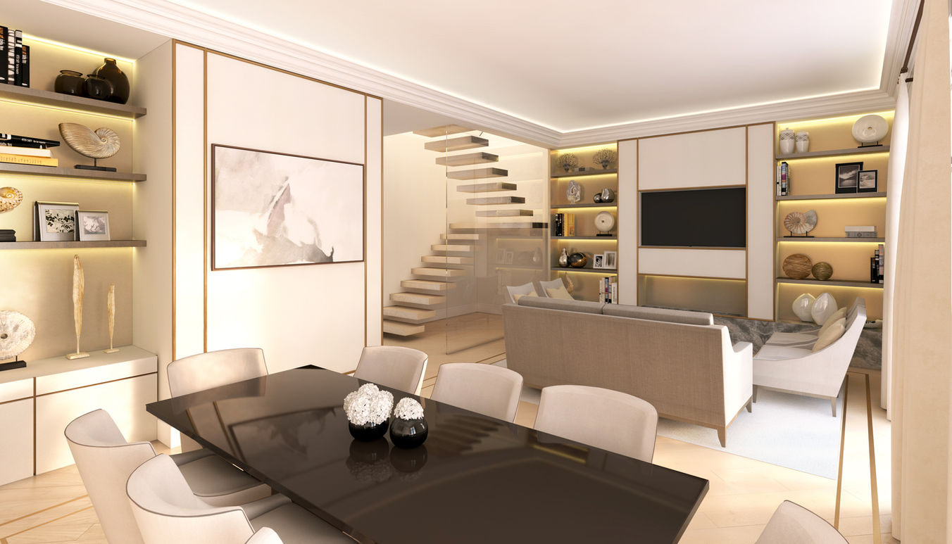 Dining room view of the luxury lateral apartment in Kensington, London.