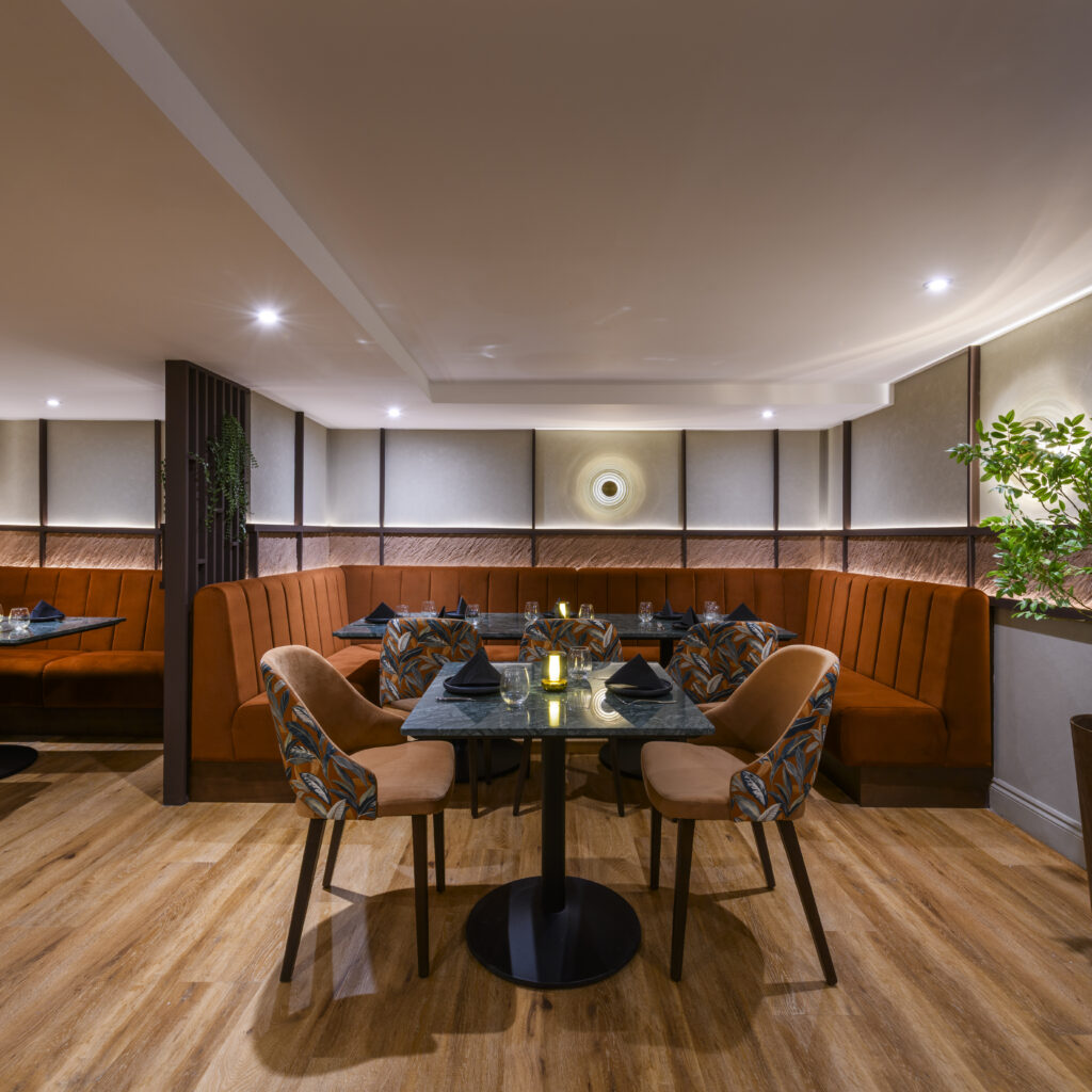 The sensory journey continues through a rich tapestry of textures, where textured painted walls and handmade concrete panels add a sense of theatrical drama. The bespoke furniture serves as a primary design feature, with dining chairs upholstered in vibrant leaf motifs to mimic a forest in bloom, contrasted by fixed banquette seating in deep burnt orange velvet. This lush, tactile environment is further enhanced by artificial trees and cascading greenery, creating a cohesive and immersive ecosystem. By blending high-energy lounge areas with a formal dining sanctuary, Mezwaani offers a unique, world-class fusion of Indian and Oriental heritage in the heart of Sheffield.